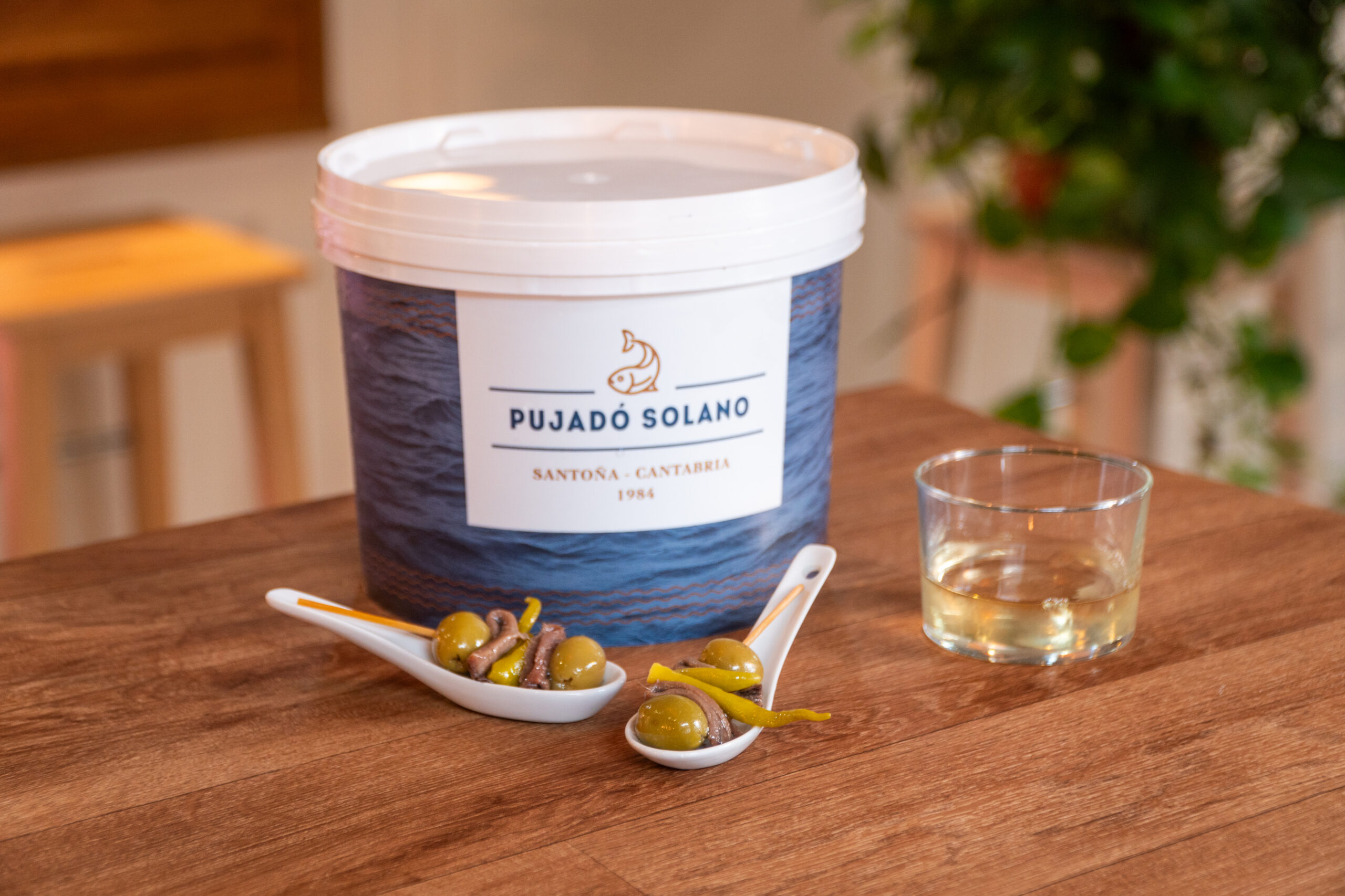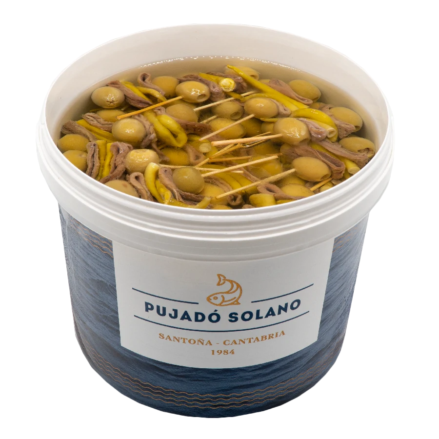 Ingredientes: anchoas (Engraulis Encrasicolus), aceitunas, piparras, aceite de girasol y sal.