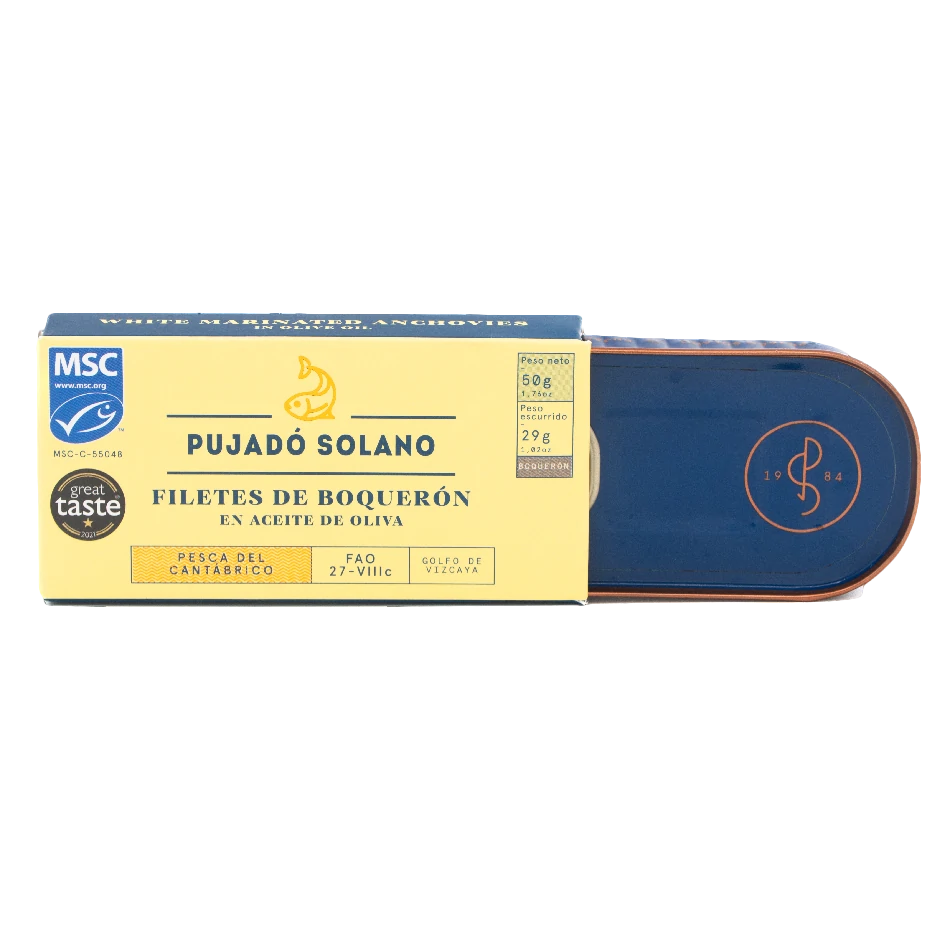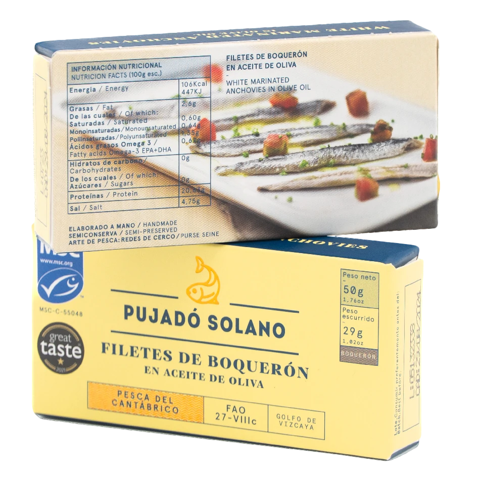 Ingredientes: boquerones frescos del Cantábrico (Engraulis encrasicholus), vinagre de vino blanco, aceite de oliva y sal marina.