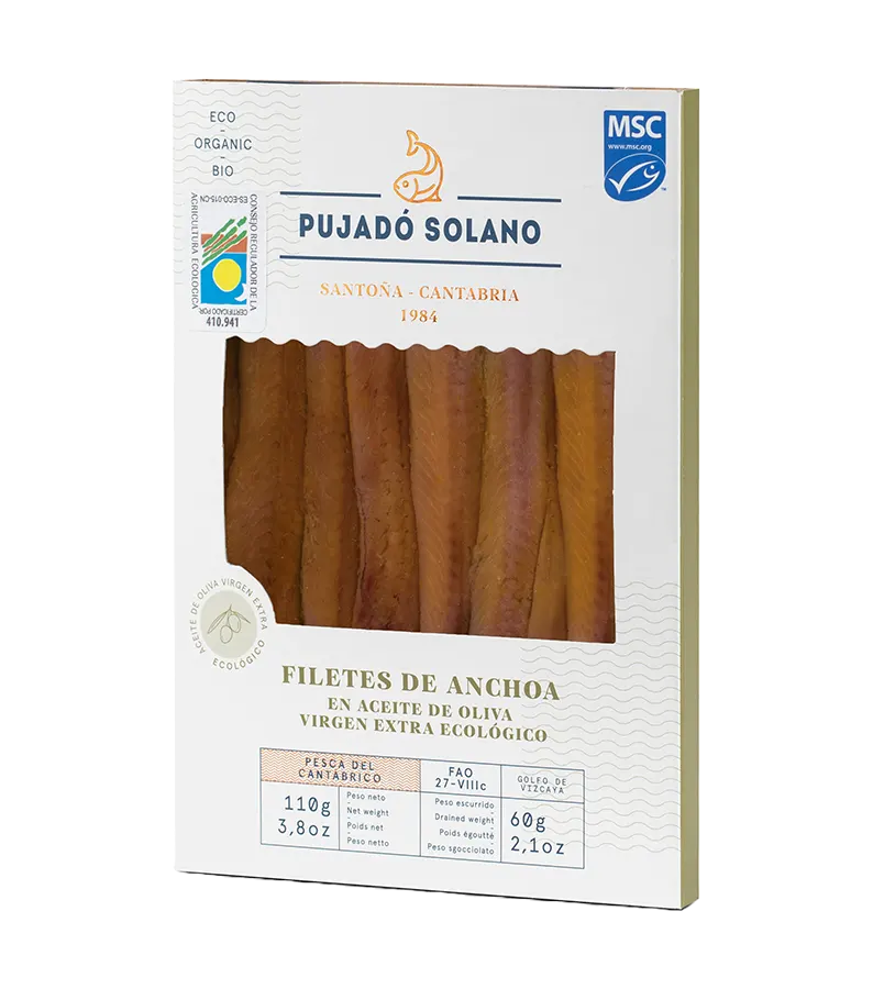 FILETES DE ANCHOA DEL CANTÁBRICO DE COSTERA EN ACEITE OLIVA VIRGEN EXTRA ECOLÓGICO ELABORADOS A MANO EXCLUSIVAMENTE CON PESCADO CAPTURADO EN PRIMAVERA Y DE FORMA SOSTENIBLE.
