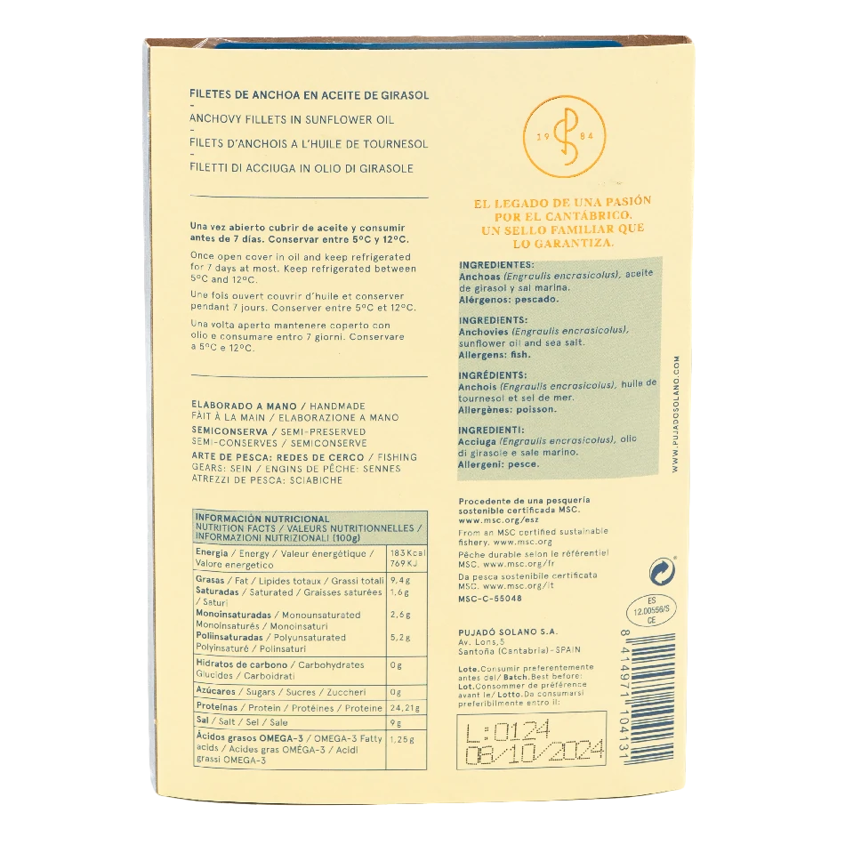 Ingredientes: anchoas del Cantábrico (Engraulis encrasicholus), aceite de girasol y sal marina.