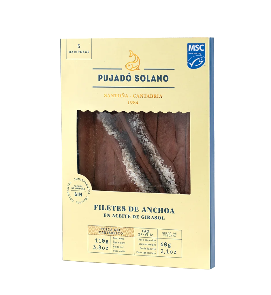 FILETES DE ANCHOA MARIPOSA DEL CANTÁBRICO DE COSTERA EN ACEITE DE GIRASOL ELABORADAS A MANO EXCLUSIVAMENTE CON PESCADO CAPTURADO EN PRIMAVERA Y DE FORMA SOSTENIBLE.
