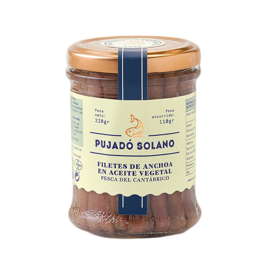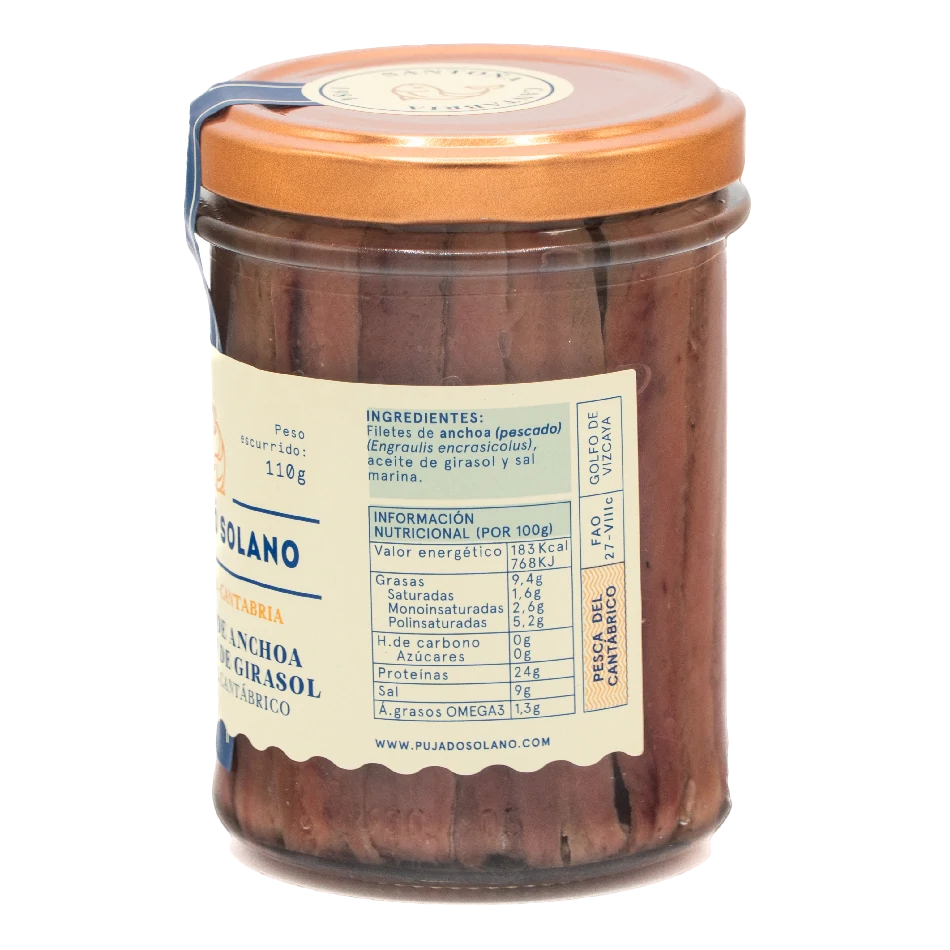 Ingredientes: anchoas del Cantábrico (Engraulis encrasicholus), aceite de girasol y sal marina.