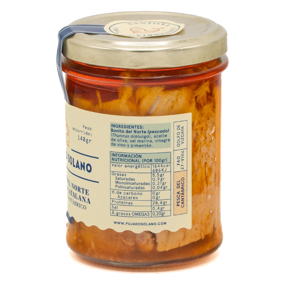 Ingredientes: bonito del norte (Thunnus alalunga), aceite de oliva, sal marina y salsa catalana (aceite de oliva, vinagre y pimentón).
