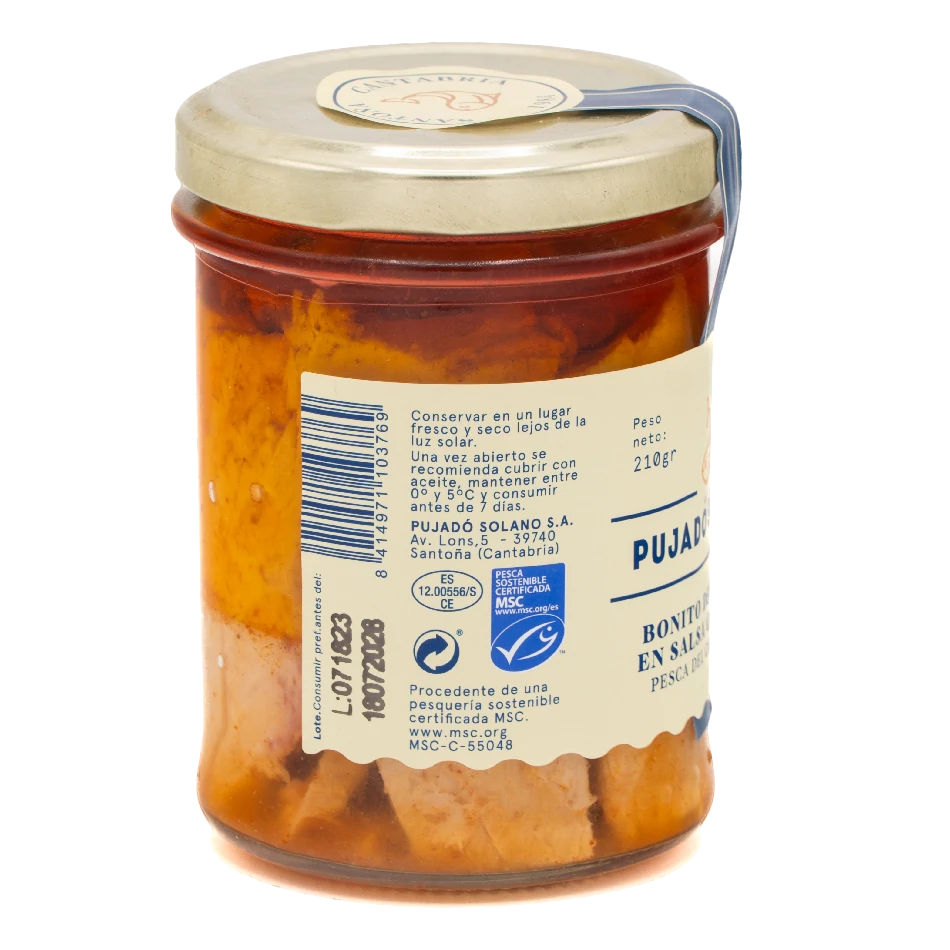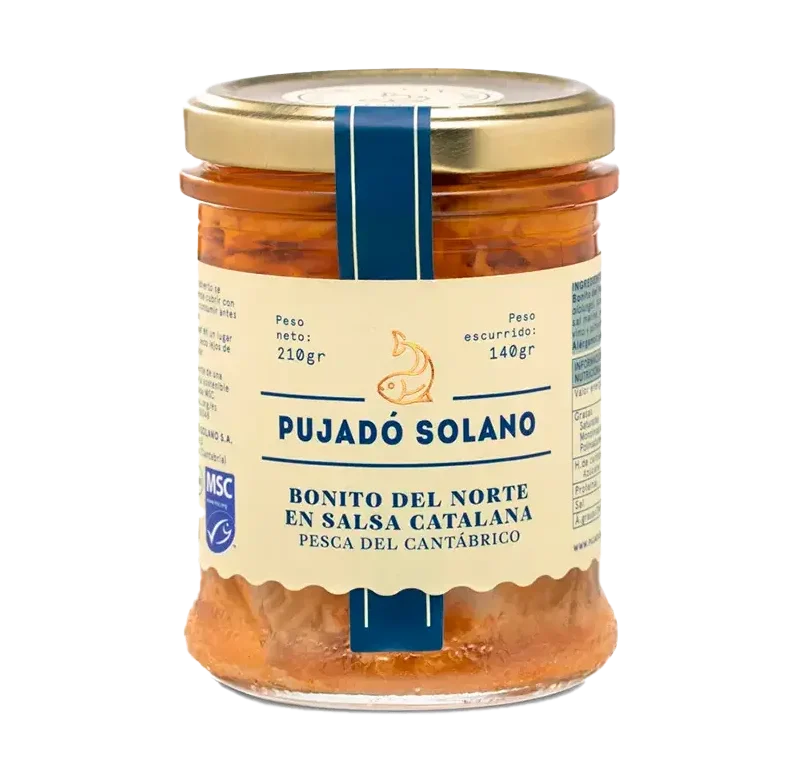 Tarro de cristal con bonito del norte de costera, preparado en salsa catalana, 210 g. Perfecto para disfrutar en ensaladas o tapas.