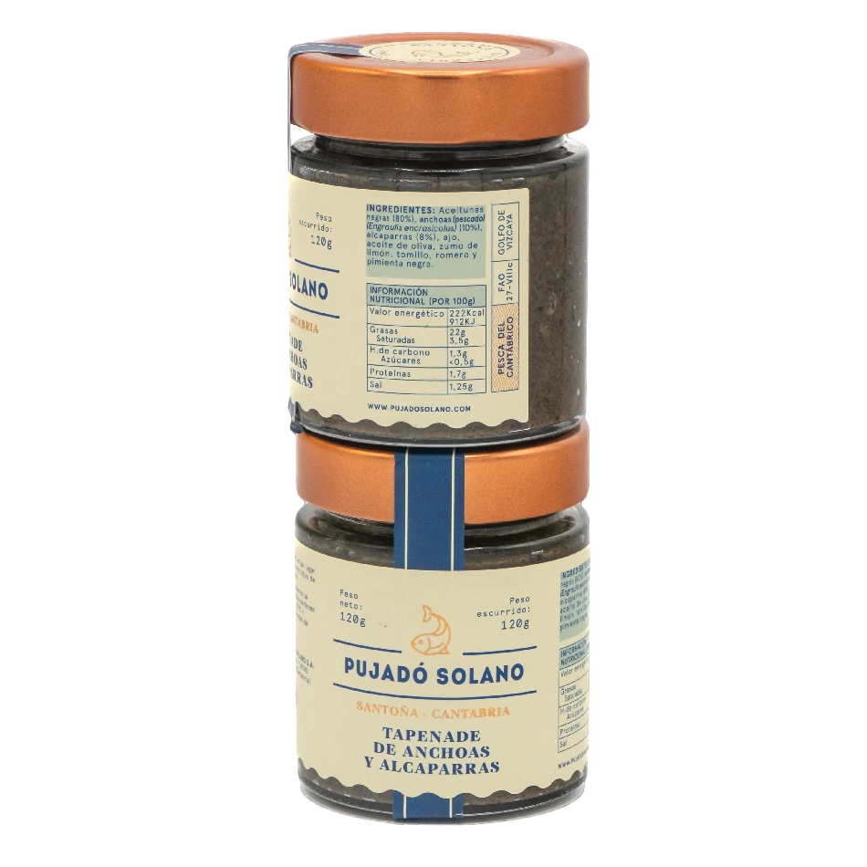 Ingredientes: aceitunas negras de Aragón, anchoas, alcaparras, ajo, aceite de oliva, limón, especias y hierbas aromáticas.